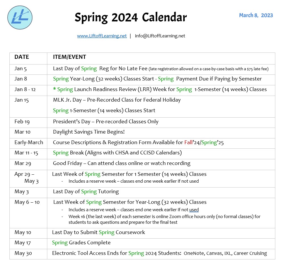 * Launch Readiness Review (LRR) Week - Each class has an online LRR meeting before classes start to meet each other, verify electronic tools work well, and answer any questions. In general, the LRR online meeting for each class is the same day and time as the first class of the semester. Students with schedule conflicts can watch the recording, attend the LRR for another class, or stop by online office hours for help.